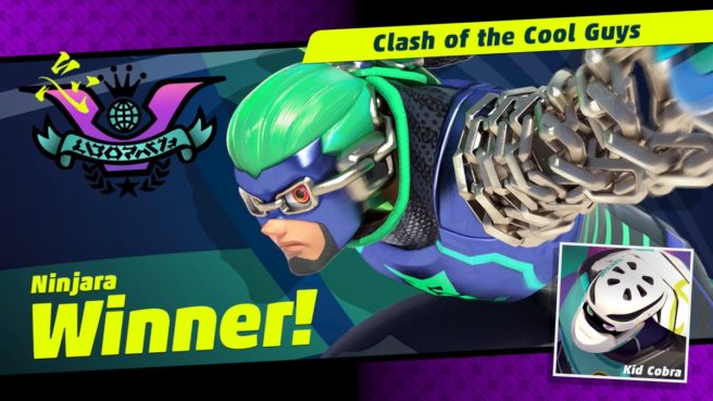 Round 5 of the ARMS Party Crash Bash has ended. In the “Clash of the Cool Guys”, Ninjara was victorious over Kid Cobra, 52% to 48%.