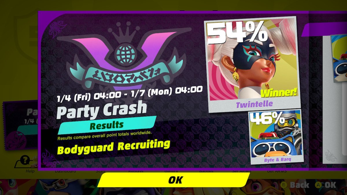 Round 6 of the ARMS Party Crash Bash has finished. Ribbon Girl was victorious, beating out Misango 54%-46%.