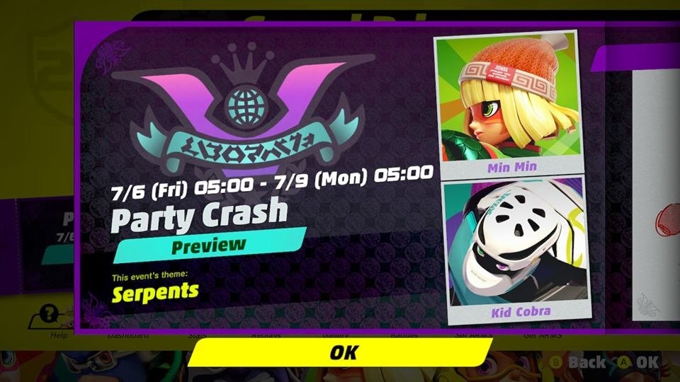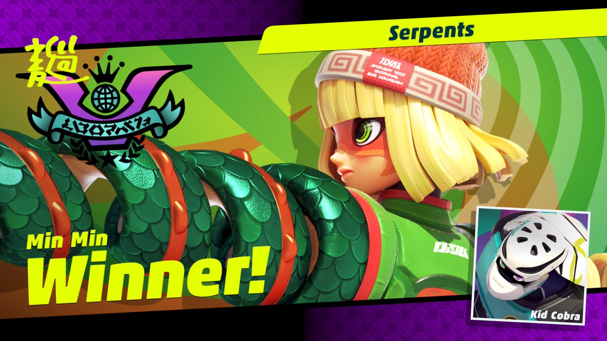Nintendo has revealed the next Party Crash for ARMS. Next week, Min Min and Kid Cobra will be featured in the latest event. The theme is simply “Serpents”.