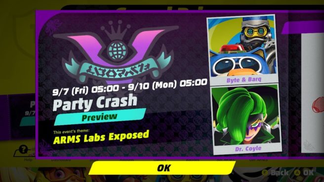 Next weekend, another Party Crash will be taking place for ARMS. Byte & Barq and Dr. Coyle will be battling it out in the latest event. “ARMS Labs Exposed” is the theme.