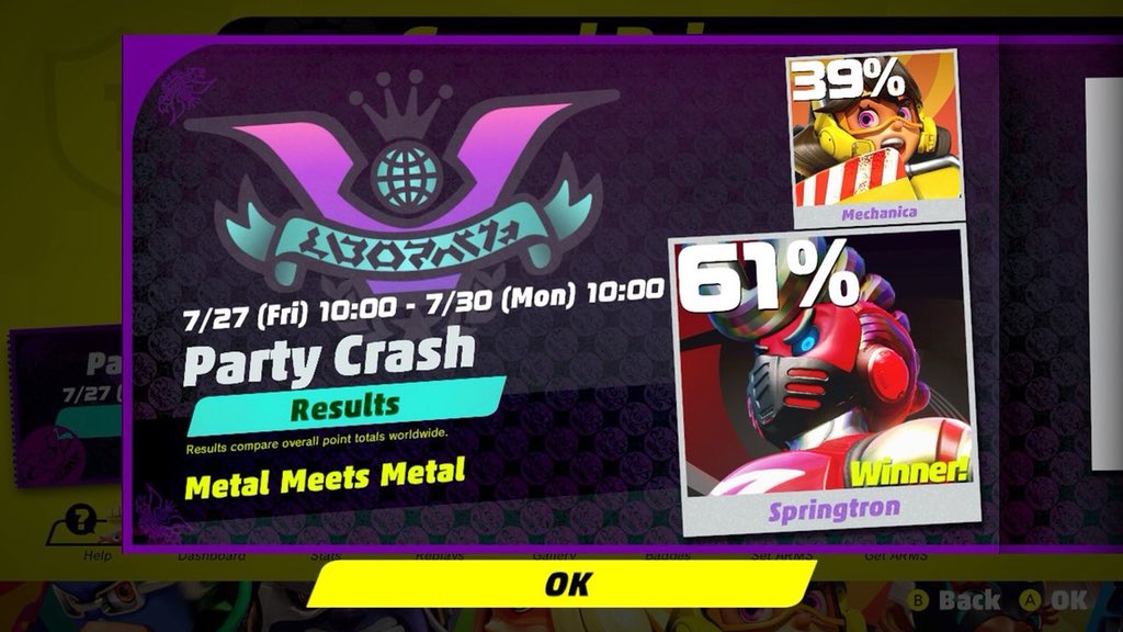 Nintendo has now posted the results. Springtron overwhelmed Mechanica, taking the latest Party Crash with a final tally of 61% to 39%.