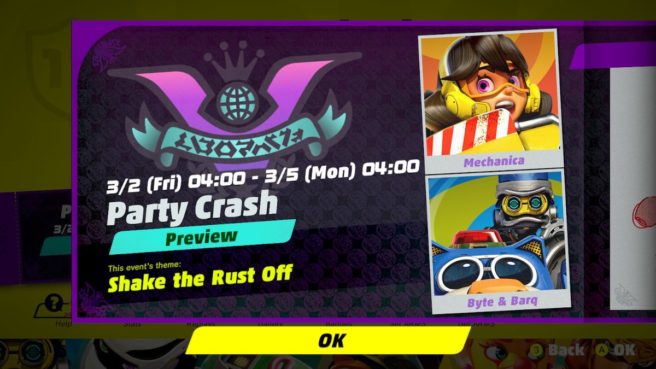 Next week, Nintendo will be hosting the sixth Party Crash in ARMS. The new event will feature Mechanica and Byte & Barq going head to head. The theme this time around is “Shake the Rust Off”.