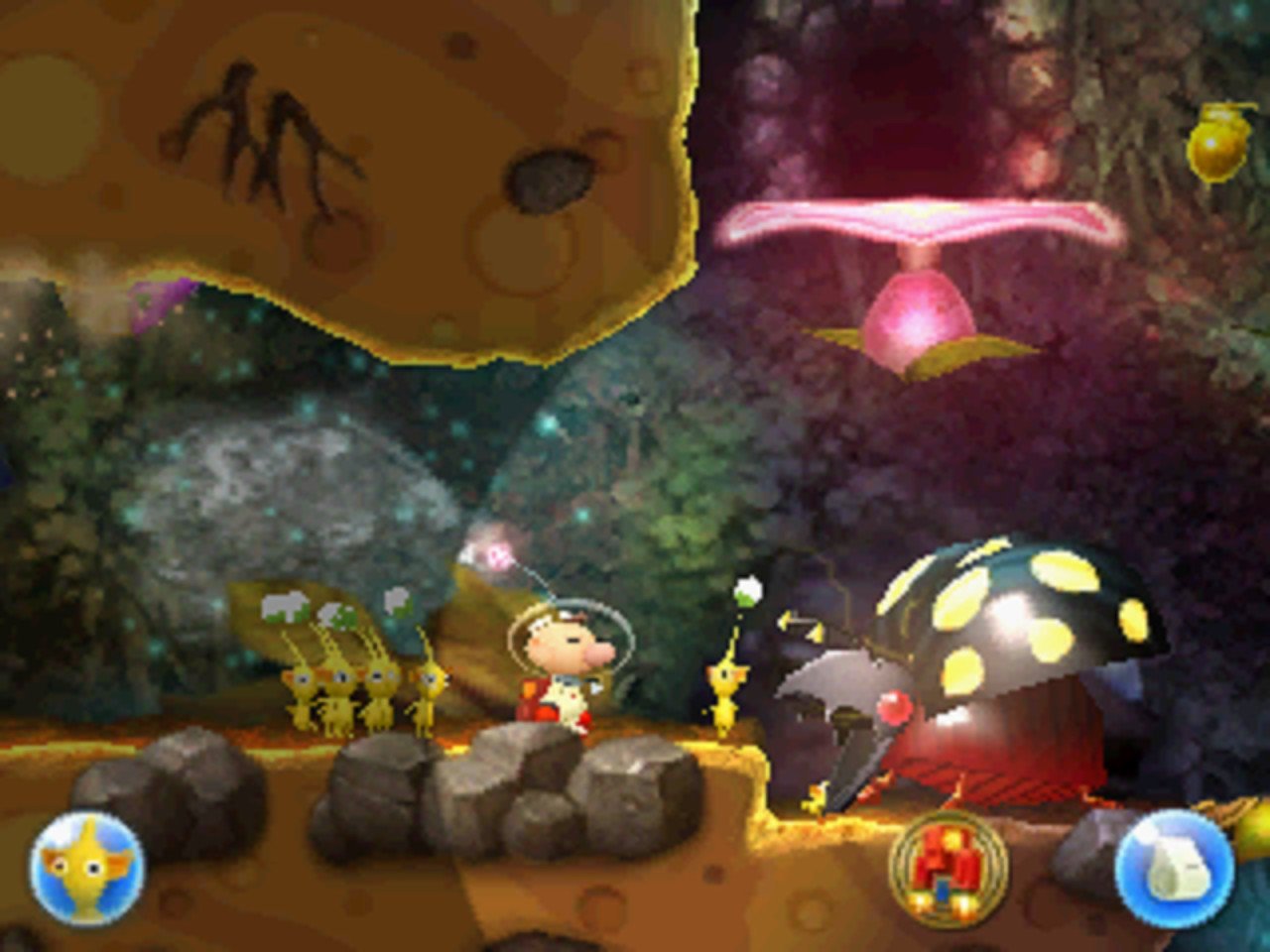 – Self-contained levels see you locating Pikmin in order to navigate a play area that consists of moving left to right and finding the occasional hidden cave entrance that houses additional Sparklium