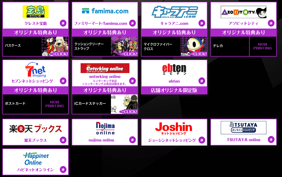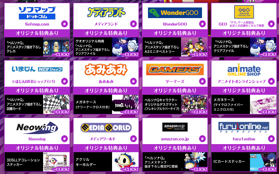 Atlus have recently shared a list of the different pre-order bonuses for Persona Q, with a number of different items on offer depending on which Japanese retailer the game is purchased from. These gifts range anywhere from 3DS skins to key-chains along with all sorts of other Persona themed goodies. Below we’ve got screenshots of the different pre-order offers available, as well as where you can get them.