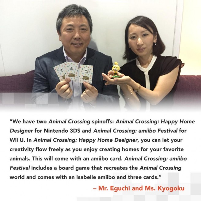 Animal Crossing developers Aya Kyogoku and Katsuya Eguchi shared a few words about Happy Home Designer and amiibo Festival over on Nintendo of America’s Twitter account. Have a look at what they had to say in the image above.