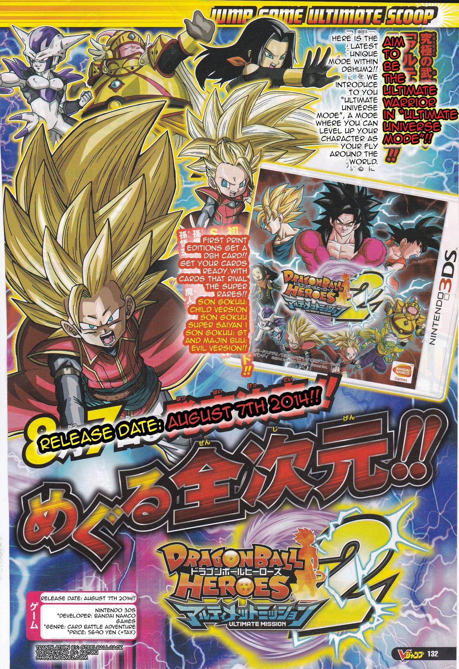 The latest issue of V-Jump confirms that Dragon Ball Heroes: Ultimate Mission 2 will be hitting Japan on August 7. Additionally, the magazine reveals the inclusion of a new “Ultimate Universe Mode”, though details are unavailable at this time.