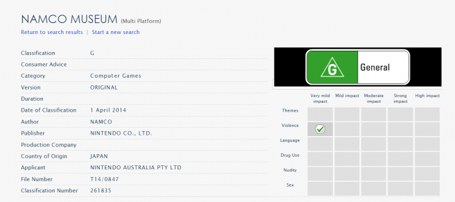 The OFLC has rated what is likely another upcoming Game Boy Advance release on the GBA Wii U Virtual Console. Earlier today, “Namco Museum” was added to the Australian classification database. I imagine we’ll be seeing this one on the eShop sometime in the future.