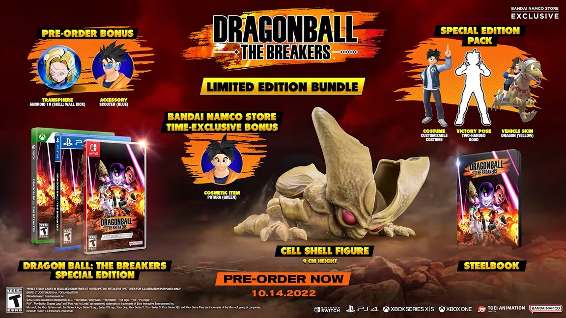 Dragon Ball: The Breakers will have a physical and digital release on Switch. The Special Edition features the full game plus the Special Edition Pack containing a customizable costume, the “Two-Handed Good” victory pose, and the “Dragon (Yellow)” vehicle skin. The Limited Edition, exclusive to the Bandai Namco store, has the Special Edition content along with a steelbook, three Raider stickers, the Cell shell figure, and the “Potara (Green)” in-game accessory, which is a timed exclusive. All pre-orders come with the “Android 18 Transphere” and “Scouter (Blue)” accessory.
