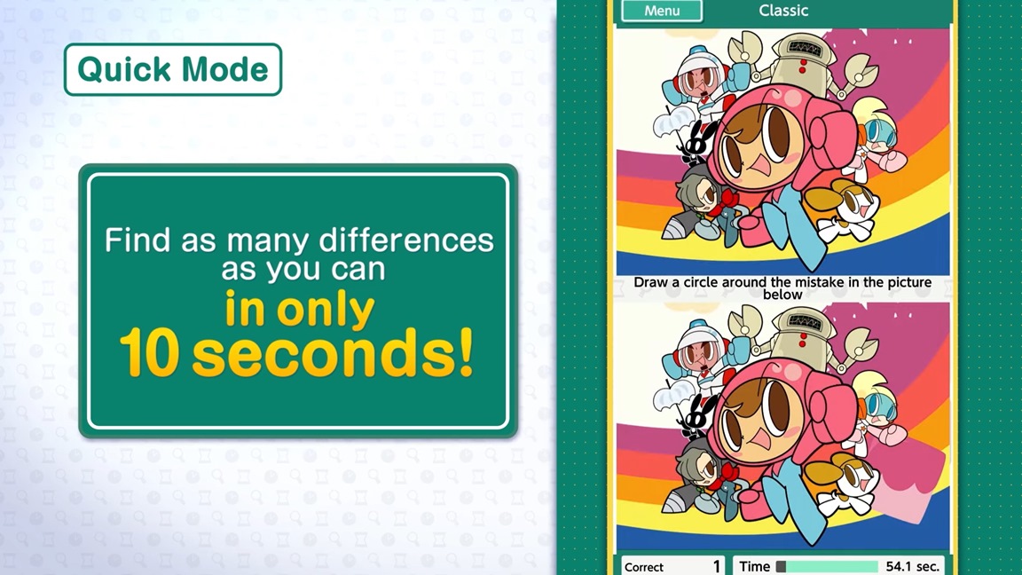 Japan originally received it last April. It’s a spot the difference puzzle game that “stimulates the brain and trains the eyes with fun games where players try to find mistakes, fit puzzle pieces, and uncover hidden objects in a gallery of creative images.” Other features include new game types, a new Party Mode, and various new illustrations.