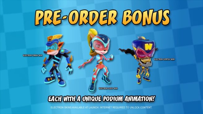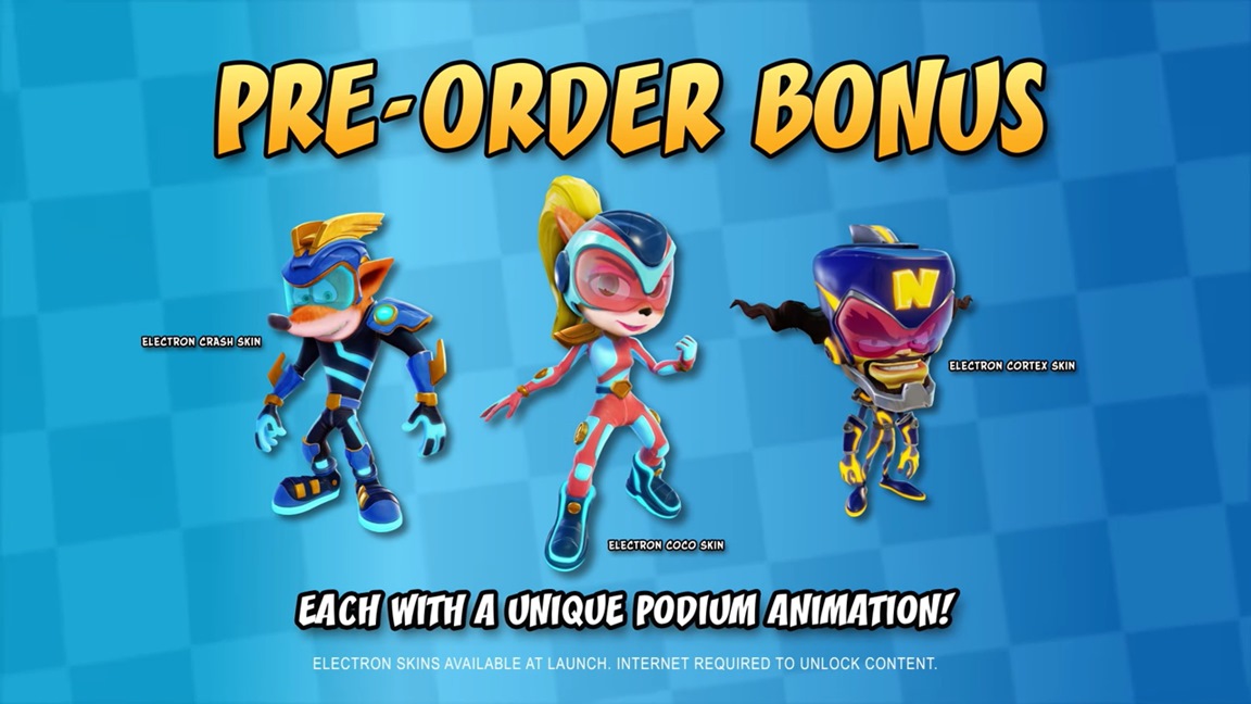 Crash Team Racing Nitro-Fueled has received a new trailer featuring the Electron Skins. By pre-ordering the game, you’ll be granted access to these skins for Crash, Coco, and Cortex.
