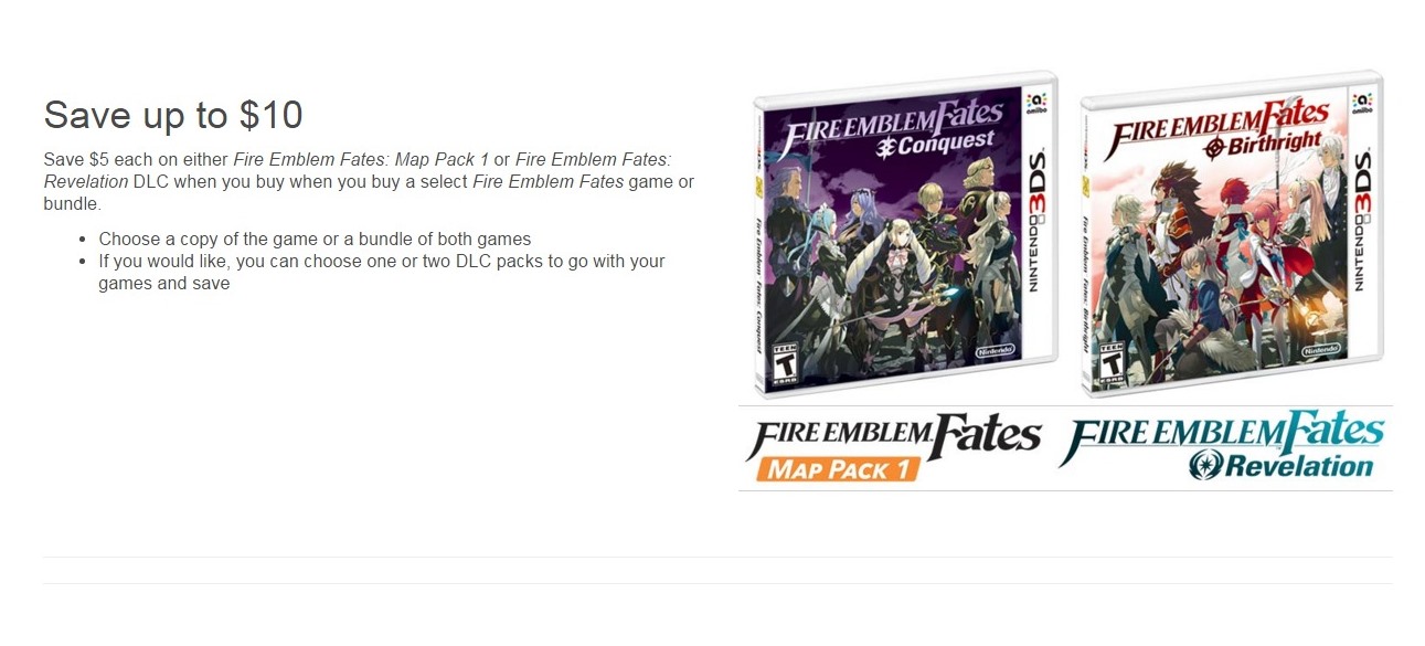Best Buy has an offer running on extra Fire Emblem Fates content. If you purchase a copy of the game or a bundle of both games, you can save $5 on Map Pack 1, and another $5 on the Revelation story. You can also choose to pick up just one of these DLC items. Visit the offer page here for extra details.