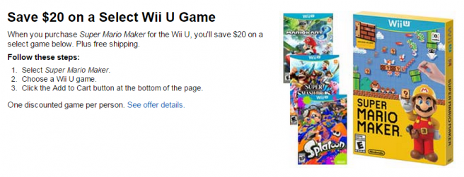 Best Buy is running an offer on Super Mario Maker this week. If you pre-order / purchase Super Mario Maker, you can save $20 on Mario Kart 8, Splatoon, or Super Smash Bros. for Wii U. The deal will last through September 12.