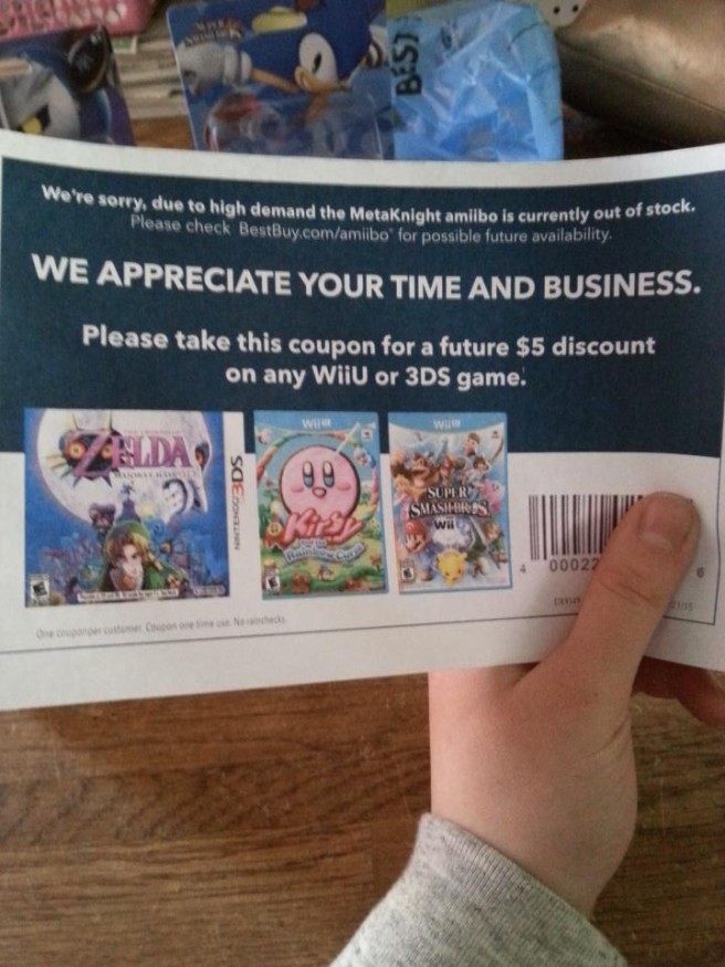 The Meta Knight amiibo should be in Best Buy locations across the United States today. However, if you head to your store and are unable to find the figure, you should be receiving a unique coupon that takes $5 off any Wii U/3DS game. This coupon will only be provided to consumers today!