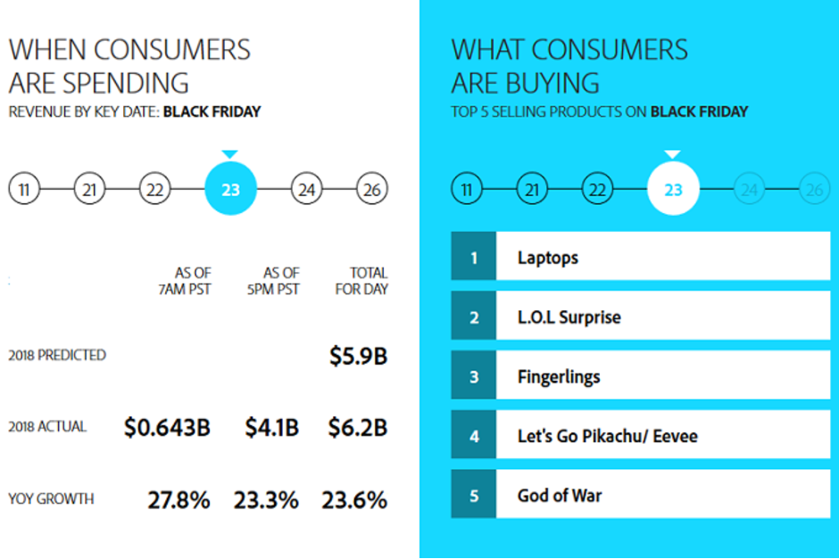 According to Adobe, the top five products purchased online in the United States were Laptops, LOL Surprise dolls and accessories, Fingerlings baby pet toys for kids, God of War on PlayStation 4, and Pokemon: Let’s Go, Pikachu / Eevee. CNET further indicates that the new Pokemon games were top-selling products at retail in general during Black Friday.