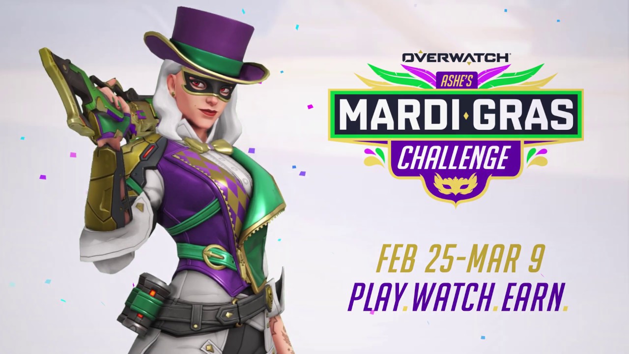 Starting today, Overwatch is hosting an Ashe Mardi Gras Challenge. Players can unlock six sprays, two player icons, and an Ashe skin until March 9. Bob has a skin featured during the event as well.