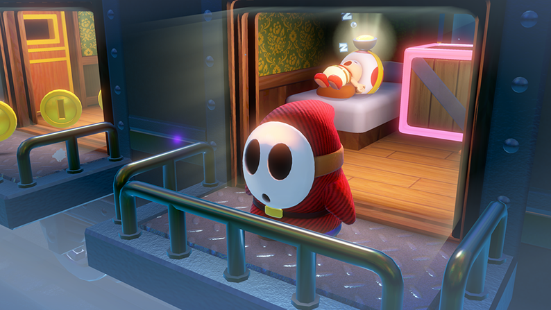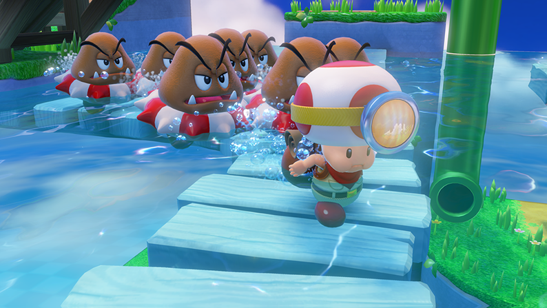 – When exiting the upper door, Captain Toad falls straight down onto the goomba, squishing him
