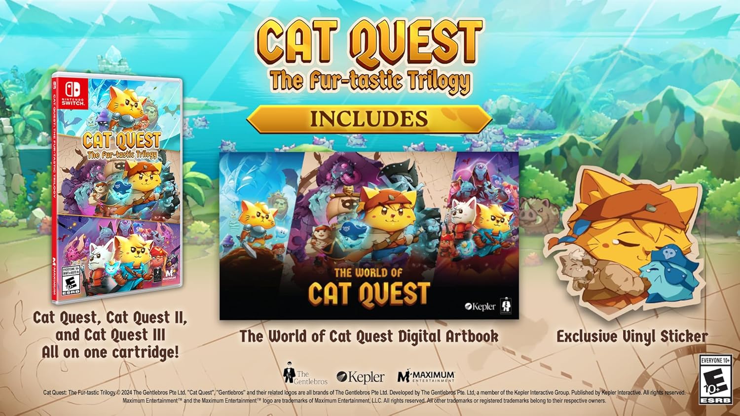 You’ll actually be getting the entire franchise here. Cat Quest, Cat Quest II, and Cat Quest III will all be included on a single cartridge. Additionally, you’ll be provided with a digital art book and vinyl sticker as bonuses.