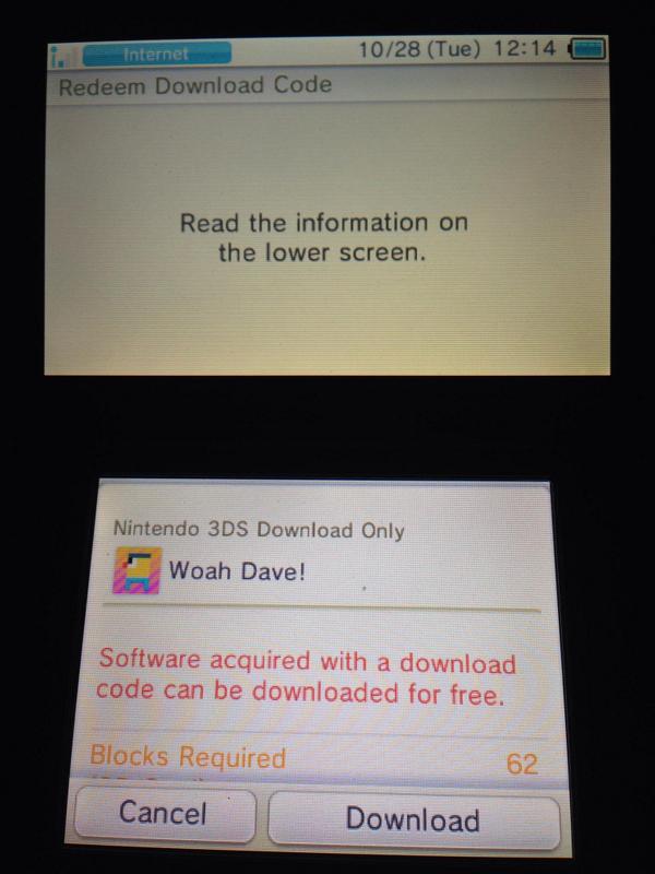 Woah Dave! should be among the smallest games available on the 3DS eShop. The game only requires 62 blocks of space, which is an extremely small download.