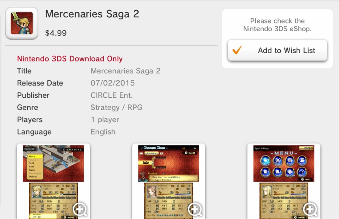 Circle Entertainment’s next game for 3DS is “Mercenaries Saga 2”. A listing on the eShop confirms that the title is due out on July 2 in North America. At launch, it will cost $4.99.