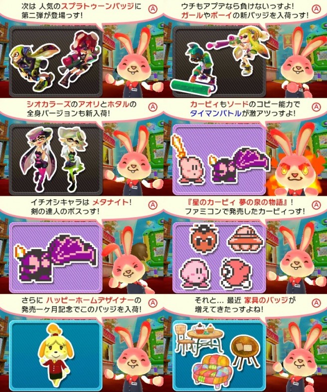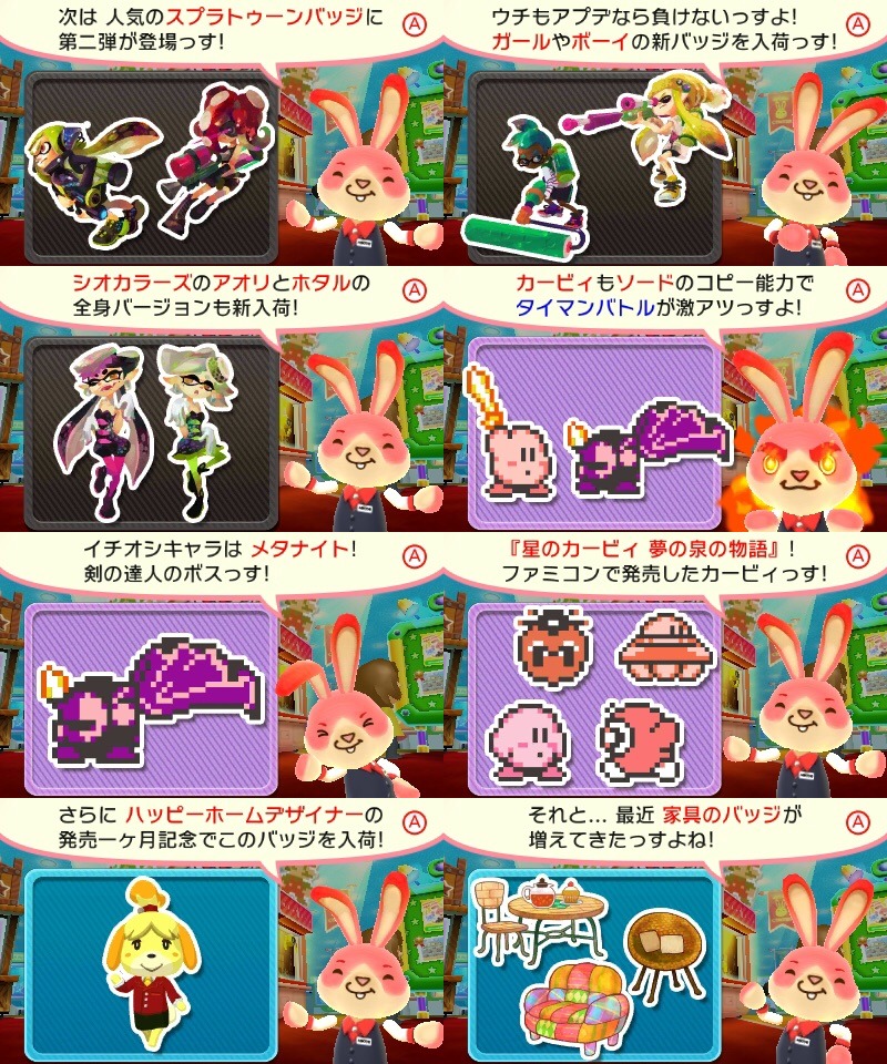 This week’s Collectible Badge Center update has gone live in Japan. Nintendo has added in badges based on Splatoon (five panels), Famicom era Kirby (four panels), and Animal Crossing: Happy Home Designer (three panels). Users also have access to two free goes, a free Baito badge (returning badges) for every 90 yen spent, and an exclusive Happy Home Designer theme for spending 180 yen.