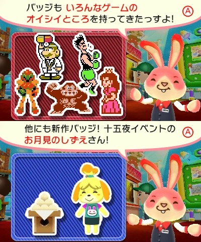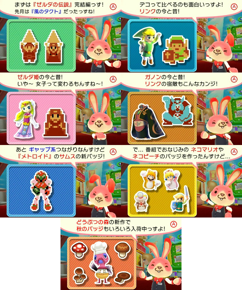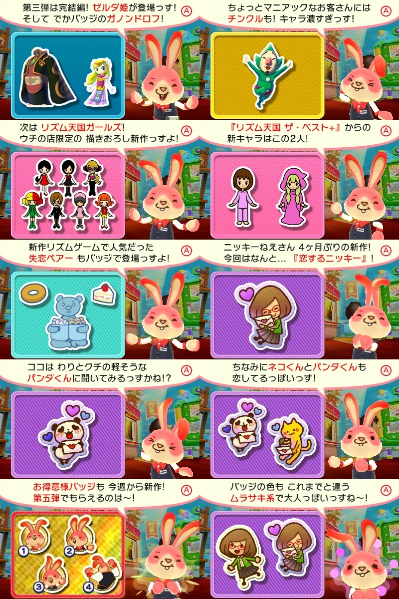 Collectible Badge Center has received its latest weekly update. The Japanese download has added in badges from The Legend of Zelda: The Wind Waker HD (eight total panels), two panels featuring the Rhythm Tengoku Girls, one Heartbreak Bear, Swapnote Nikki, two more in the pixelated non-game series, and the fifth set of Baito badges. Two free goes are available as well..