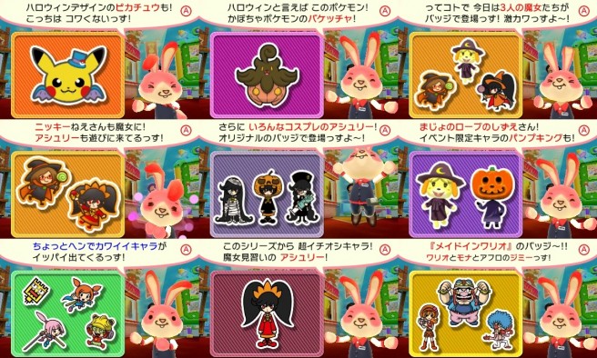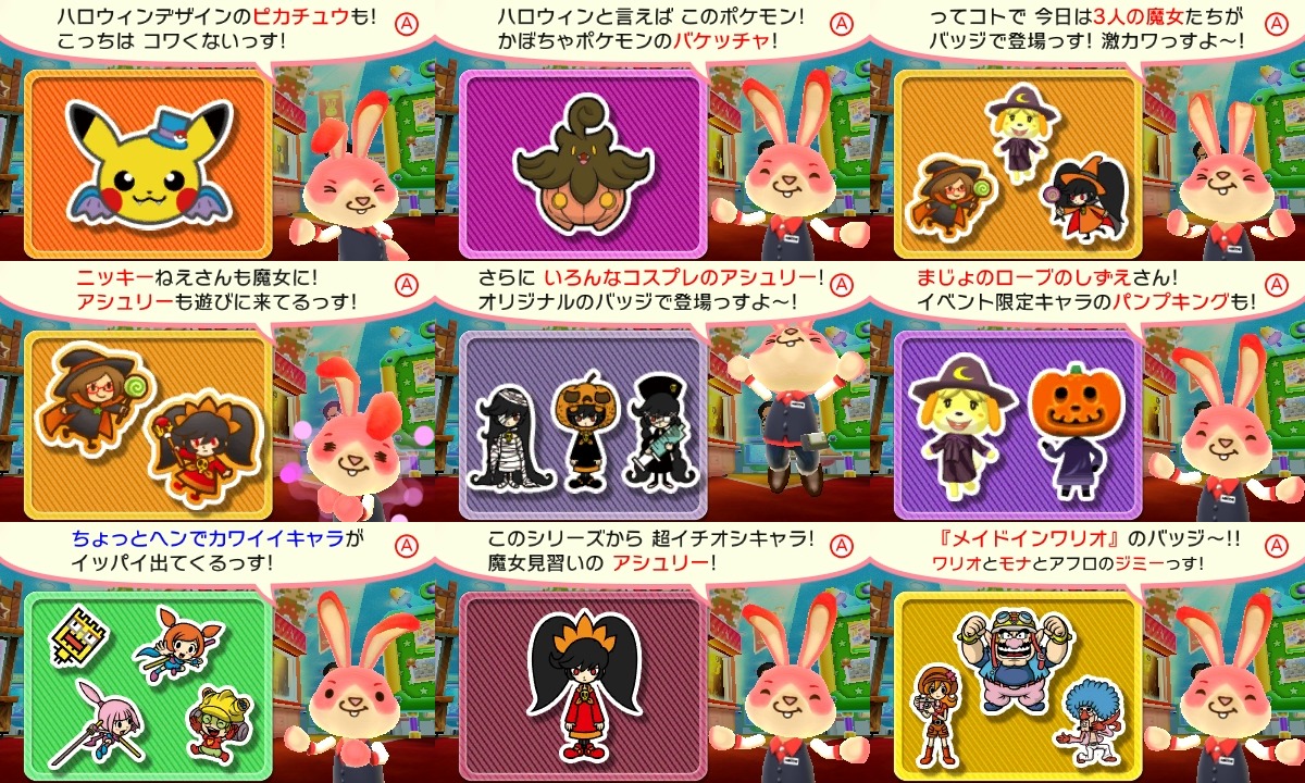 Collectible Badge Center has been updated once again. Several new WarioWare badges are available, and with Halloween in site, there are a number of badges based on the event. The lineup includes Isabelle, Nikki, Ashley and Pokemon for fifteen panels in total. That’s along with Tomodachi Collection snacks and two free goes.