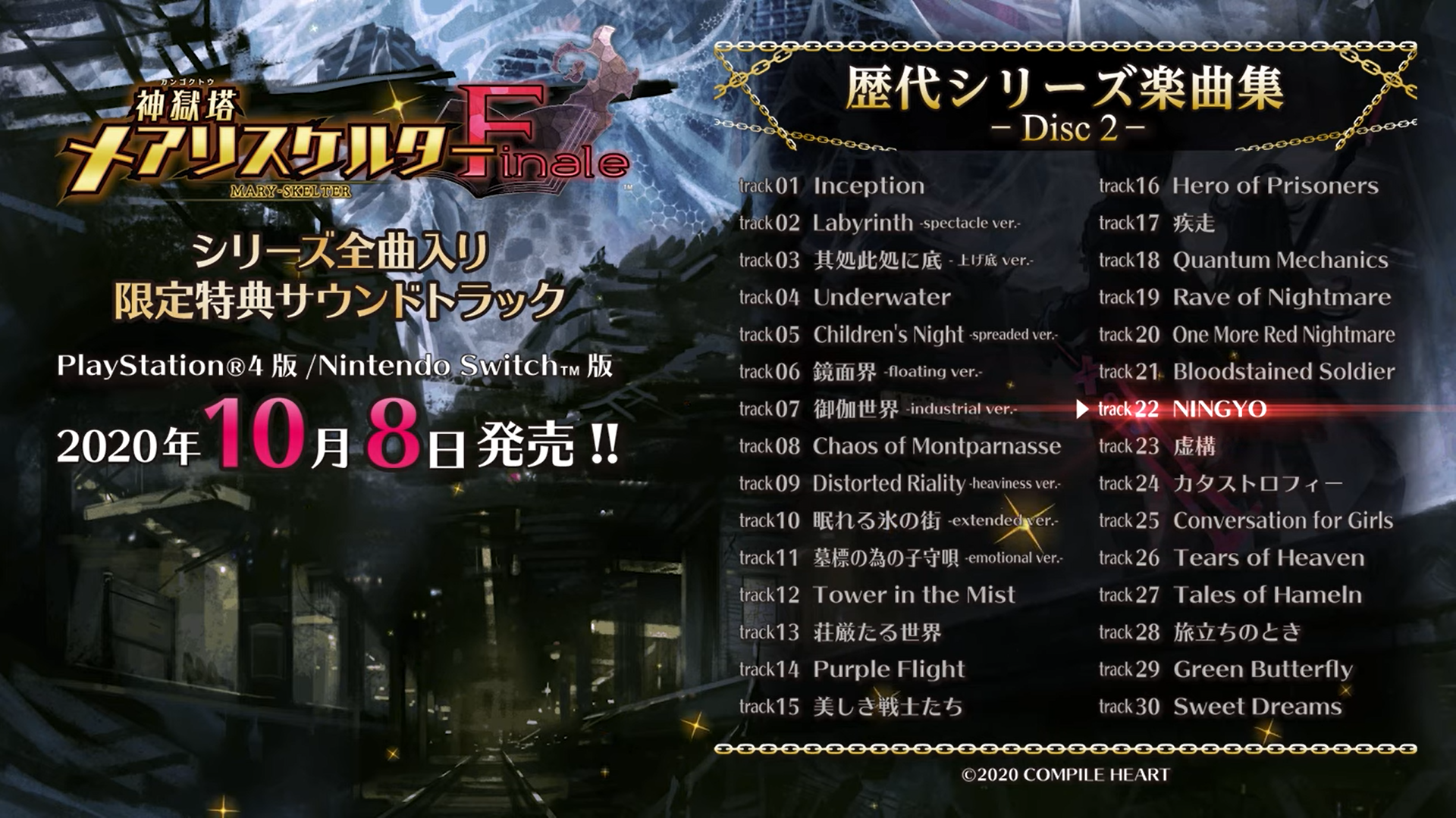 The upcoming dungeon RPG Mary Skelter Finale has received a video sampling its limited edition soundtrack. This video is roughly 18 minutes and it provides a short preview of all 78 tracks in the game.