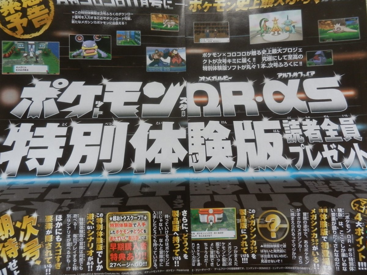 As if today’s Smash demo wasn’t enough, today info came by way of the latest CoroCoro magazine that Pokemon Omega Ruby and Alpha Sapphire will also be getting their own demo. Those that purchase the latest issue of Shonen Sunday magazine (due out October 15th) will get a serial code granting access to the trial version of the Pokemon remakes, which will give players the choice of a Grovyle, Combusken or Marhstomp to progress through the demo with, the end reward being a Mega Evolution. No word on whether this promo is exclusive to Shonen Sunday or whether or not it will go public on the eShop at a later date