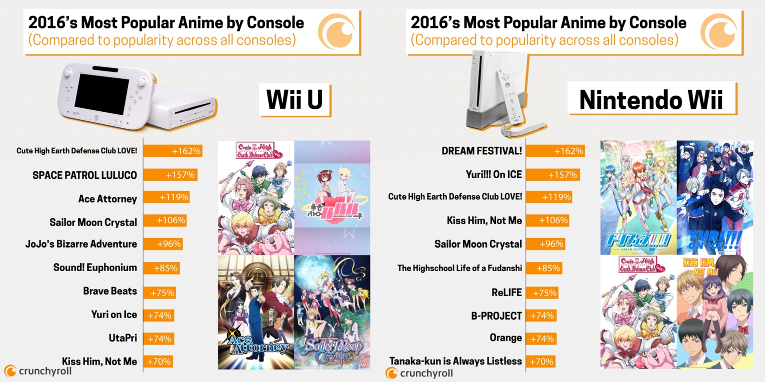 Crunchyroll has since shared a look at what its users like to watch more on Nintendo systems compared to other consoles. Cute High Earth Defense Club Love! seems to be a hit on Wii U, while Dream Festival! is watched on Wii quite a bit.
