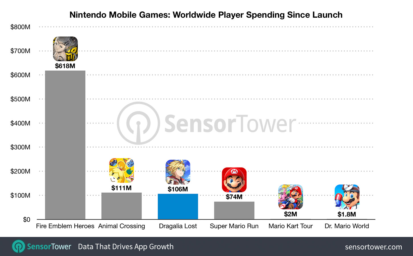 Fire Emblem Heroes is Nintendo’s biggest revenue earner on mobile at $618 million. Animal Crossing: Pocket Camp follows next at $111 million.