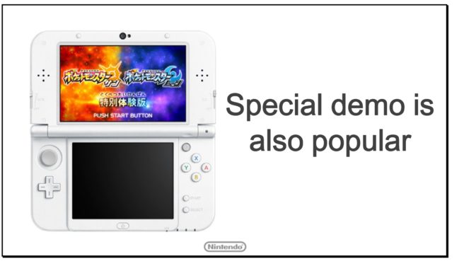 We released the Pokémon Sun and Pokémon Moon Special Demo Version starting on October 18th. Although the demo version only released last week, it has already passed 3.5 million downloads, the fastest start for any demo in the history of the Nintendo 3DS system. This point also shows the breadth of the audience for these games.