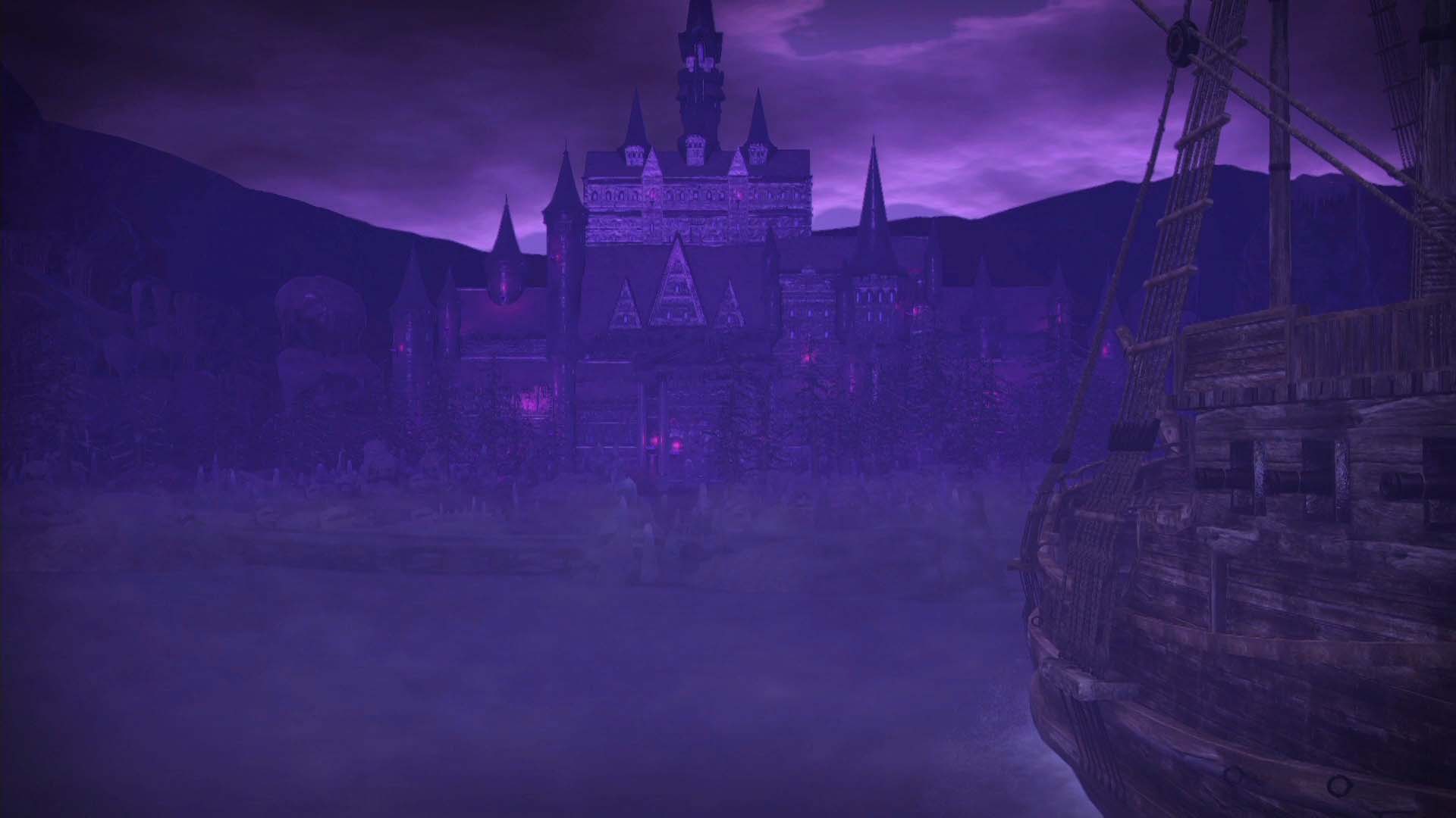 – Dark, purple clouds hang in the sky above the palace, and a rotting ship is docked in the waters beside it