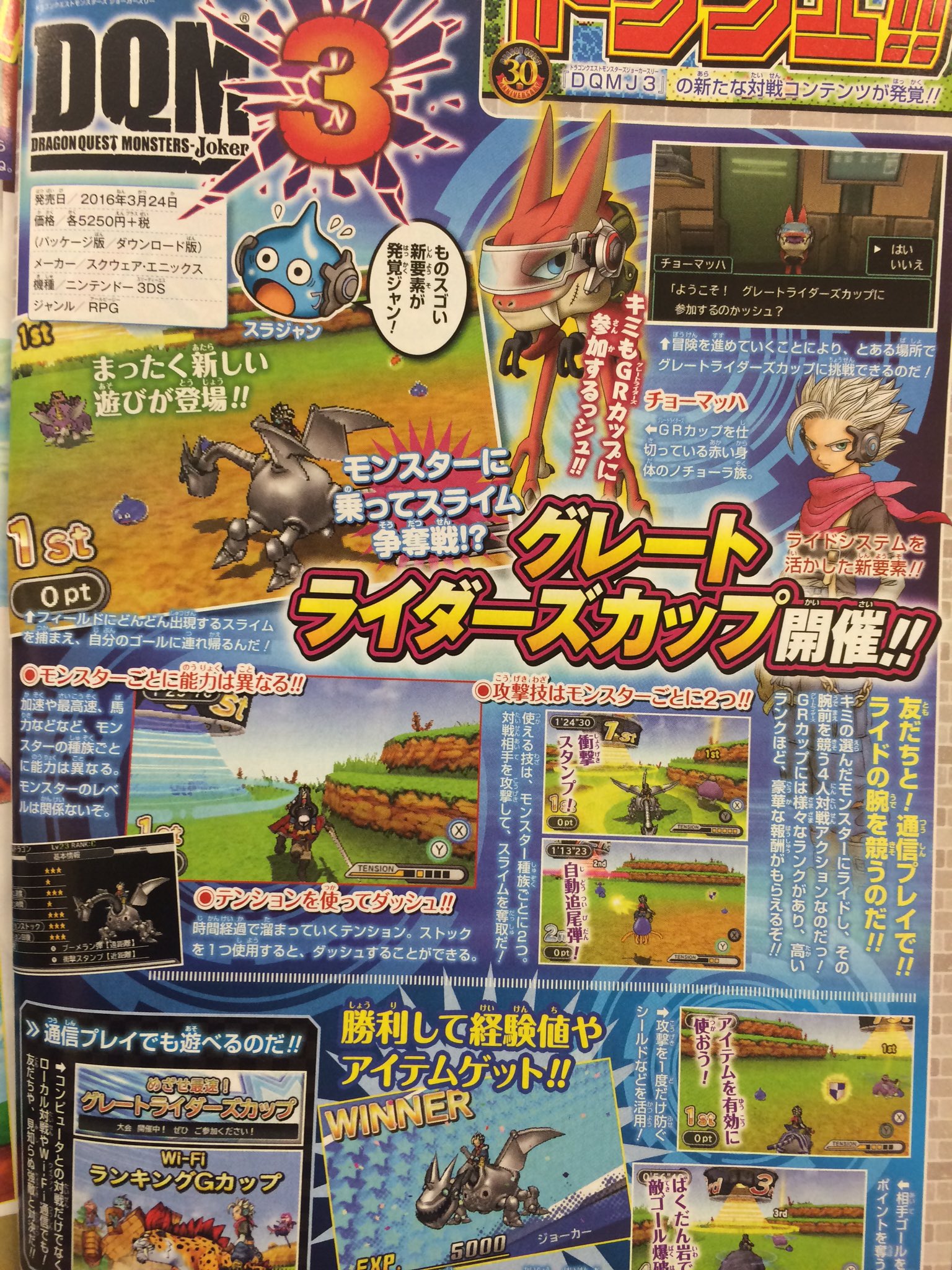The week’s issue of Jump has yet another update on Dragon Quest Monsters: Joker 3. This time around, we have news about the Great Riders Cup. This can be accessed by going through the story up to the point where you meet a Nochora who organizes the event named Chomach.