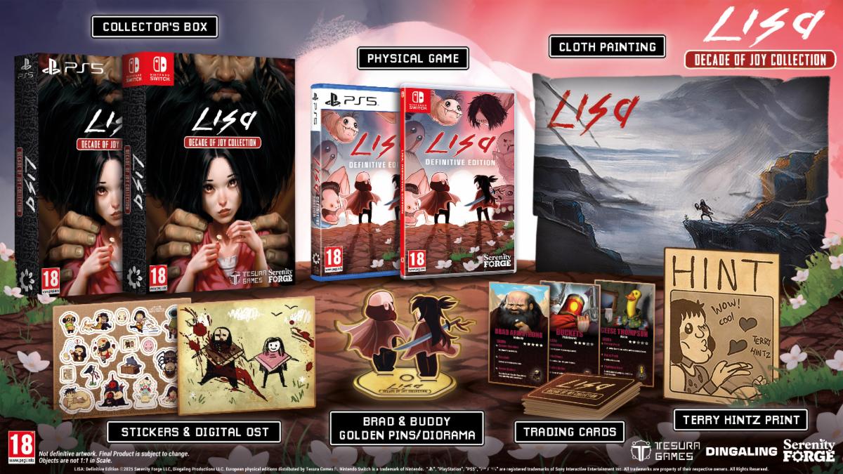 LISA: Definitive Edition will be sold standalone and as part of a Decade of Joy Collection. No matter which version you buy, you’ll get the game, sticker sheet, a digital soundtrack download card, and reversible cover. The Decade of Joy Collection adds the Brad and Buddy golden pins diorama, exclusive trading card set, Terry Hintz print, and cloth painting.
