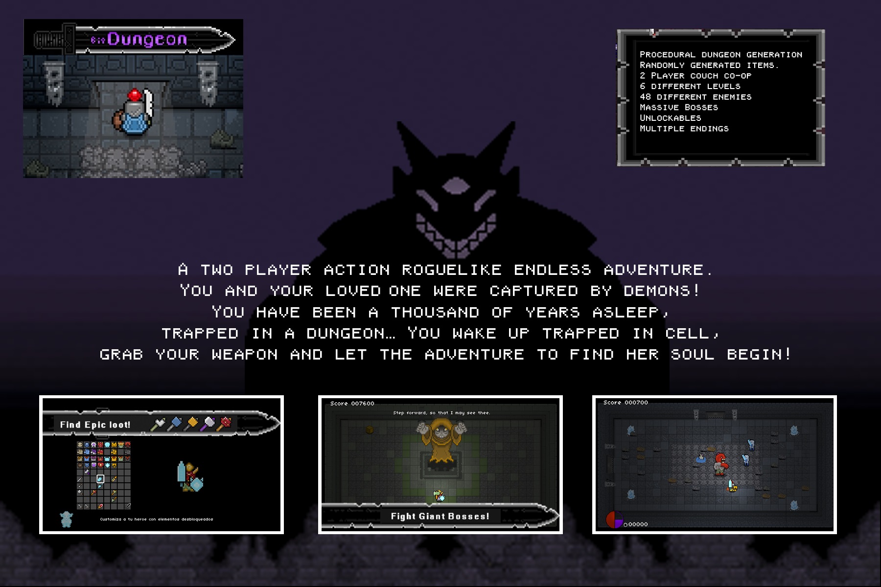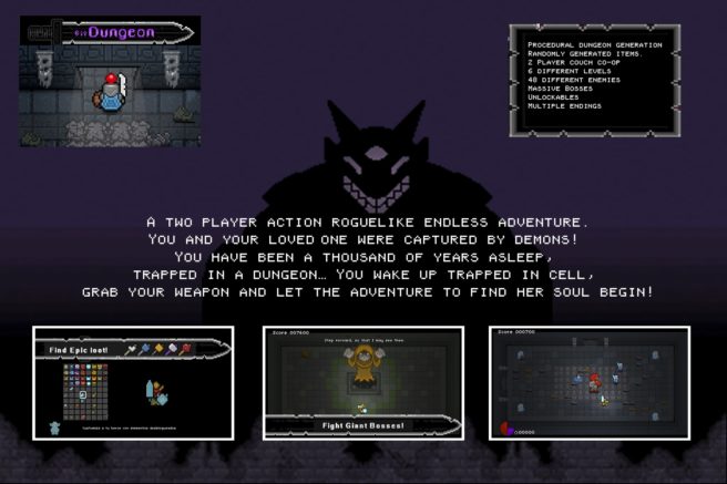 “Bit Dungeon+ is a two-player action rogue-like adventure. You and your loved one have been captured and trapped in a dungeon for a thousand years. You wake up in a cell – grab your weapon and let the quest to find her soul begin!
