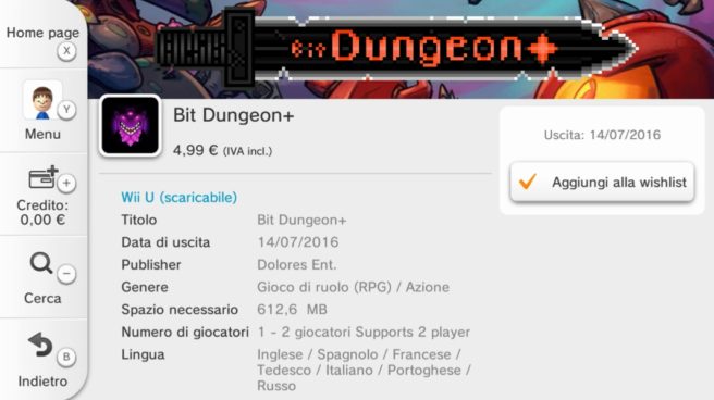 Europe will have Bit Dungeon+ on the eShop starting next week. To download the game, Wii U owners will need 332MB of free space. It launches on July 14.