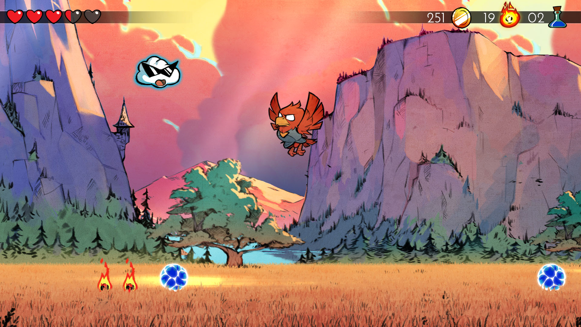 Cursed into a half-human, half-lizard monstrosity by the Meka-Dragon, a lonesome adventurer is facing the challenge of a lifetime! In search for a cure, our mutated anti-hero will explore the many traps of Monster Land… and defeat many stuff-throwing, curse-wielding dragons. How many more transformations can one hopeful body survive as it turns into a Lizard, a Mouse, a Piranha, a Lion, and a Hawk… The six different forms of our shape-shifting hero make up the cast of this non-stop action-adventure platformer!