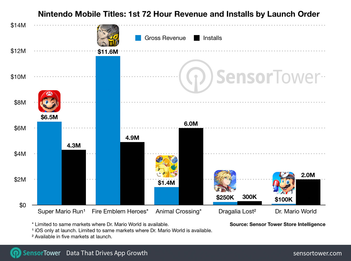 A comparison chart of Nintendo’s mobile titles can be found above. Dr. Mario World’s downloads during its first three days are at about half of Super Mario Run’s 4.3 million, Fire Emblem Heroes’ 4.9 million, and Animal Crossing: Pocket Camp’s six million. While there have been seven times as many installs as Dragalia Lost, Cygames’ title only released in five markets to start.