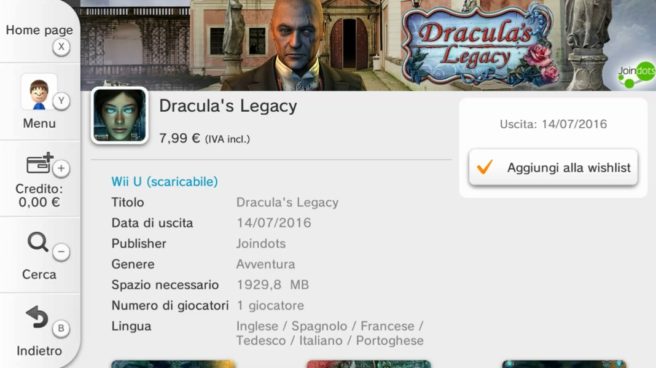 Dracula’s Legacy joins the lineup of titles set to hit the European Wii U eShop on July 14. The game’s release is confirmed through a listing on the store, which has a €7.99 price point.