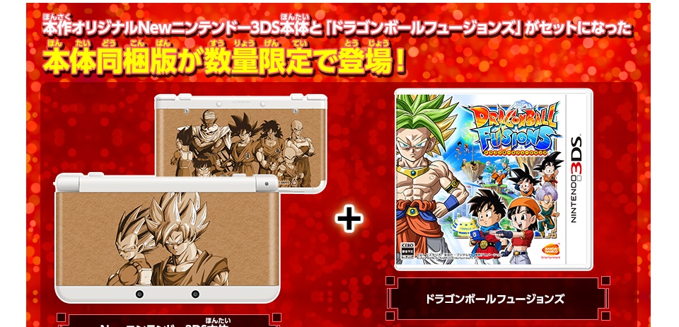 The official Dragon Ball: Fusions website was updated today. It gives us a proper look at the boxart as well as the New 3DS bundle that was shown in tiny V Jump scans from a few days ago.
