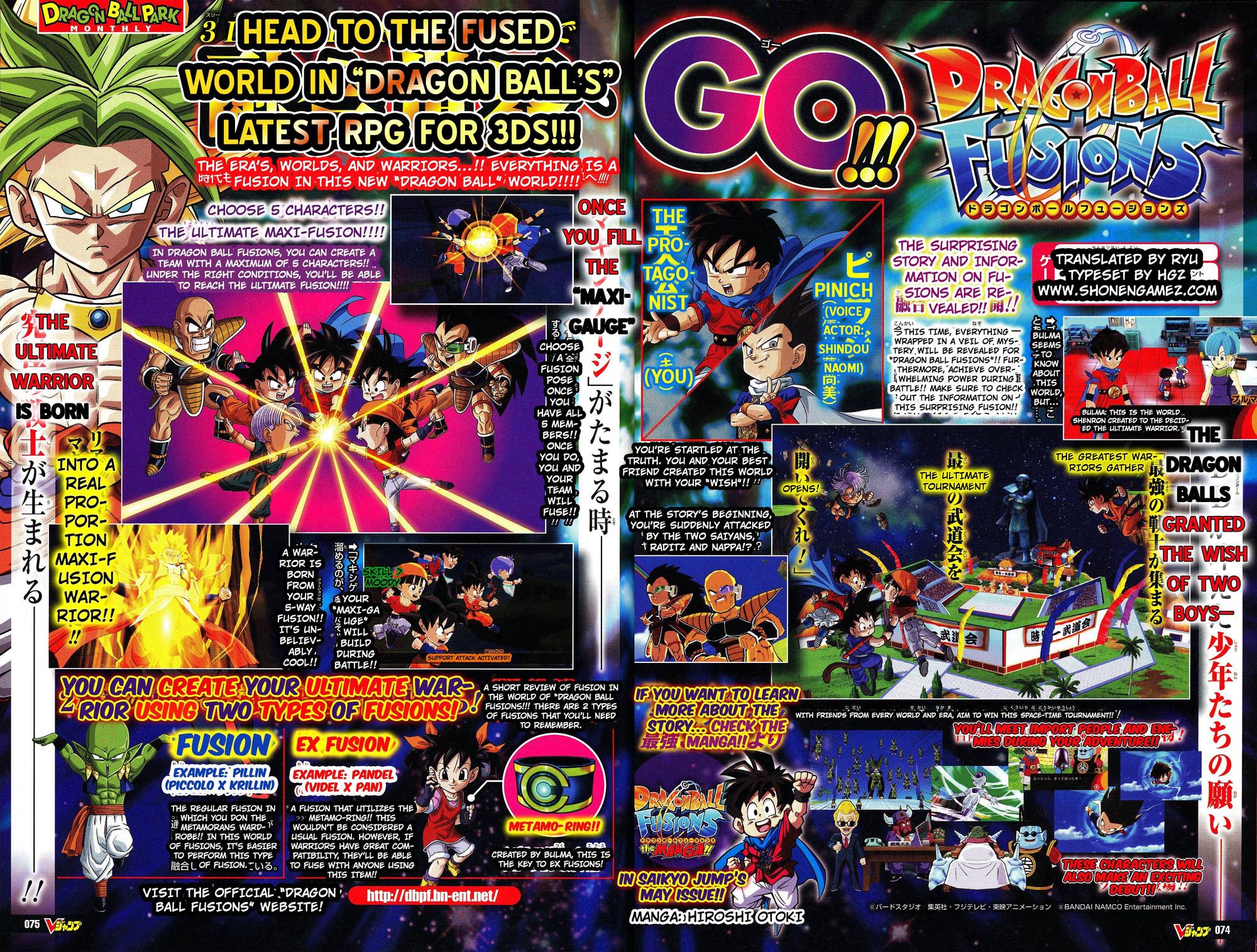 ShonenGames has managed to obtain the full scan of Dragon Ball: Project Fusion from this month’s V Jump. As it turns out, the game has a new, final name. It’ll be called “Dragon Ball: Fusions” from here on out.