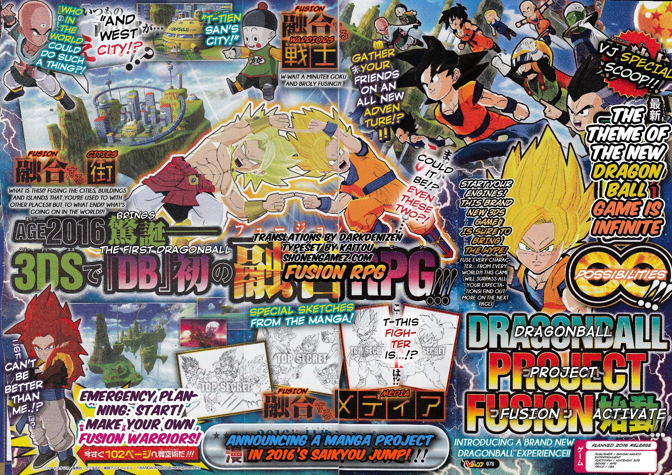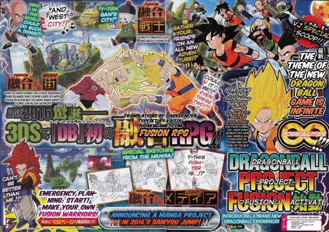 The latest issue of V Jump has revealed a brand new Dragon Ball game for 3DS known as “Dragon Ball: Project Fusion”. Not much is known at the moment, but it’s an all-new experience in the RPG genre. A fusion between Goku and Broly is also featured.