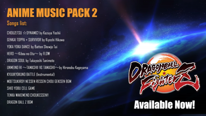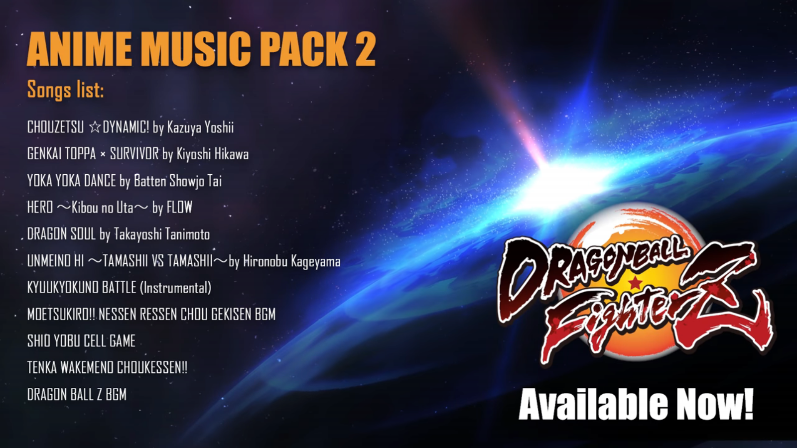 Both Dragon Ball FighterZ and Dragon Ball Xenoverse 2 are getting a new piece of DLC: the second Anime Song Pack adds a total of 11 songs from Dragon Ball Z, Dragon Ball Z Kai and Dragon Ball Super to each game. You can see the full list of songs in the image above. The song pack is available to purchase right now.