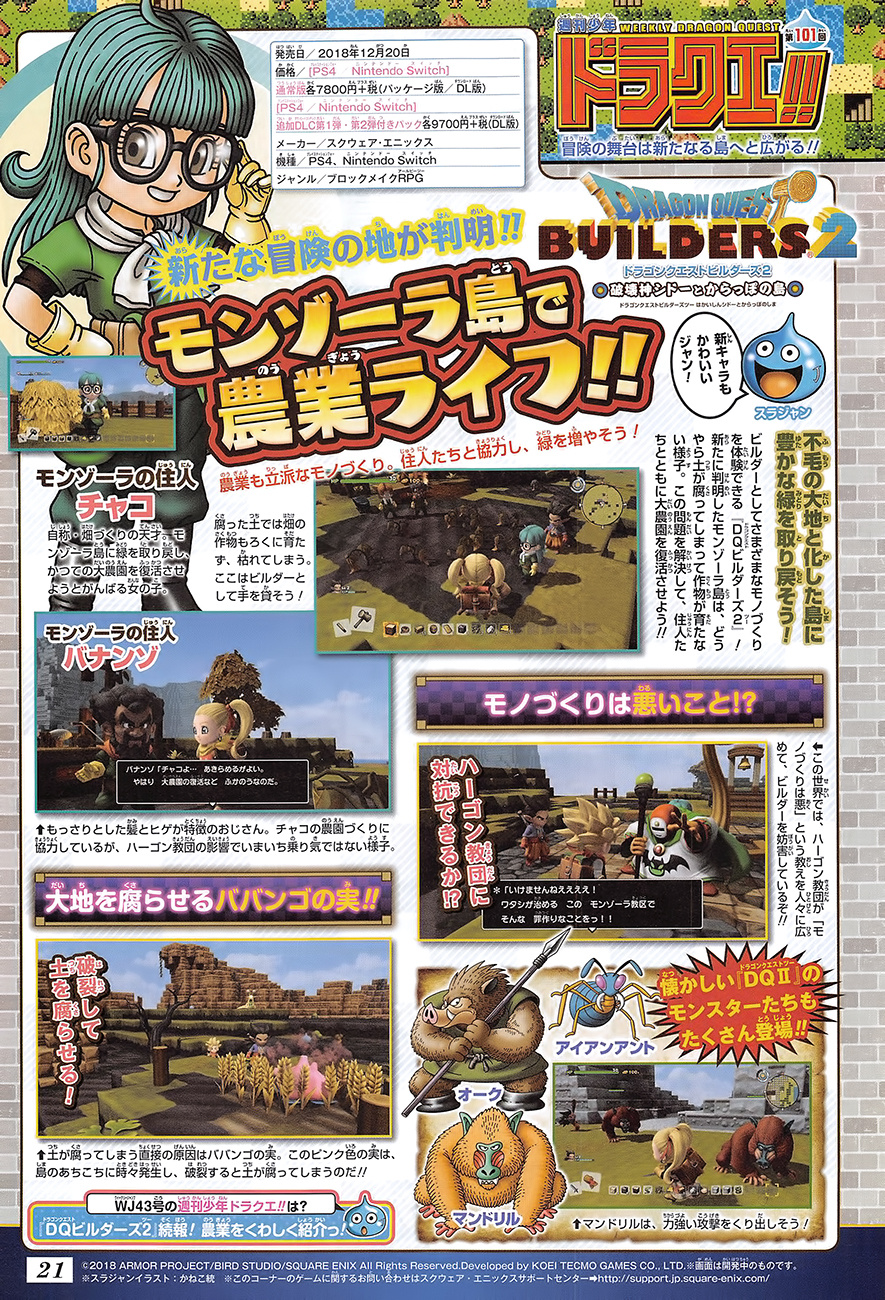 Dragon Quest Builders 2 is featured in the latest issue of Weekly Jump. In it, we hear about the “newly discovered” Monzola Island, two characters that live there, and more details about the world.