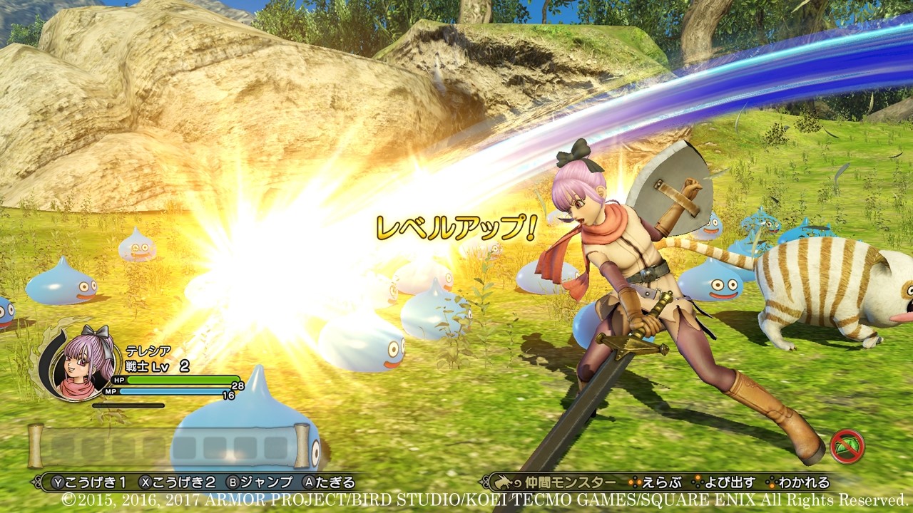 First, HD Rumble is being implemented. You will feel vibration from the Joy-Con when slashing enemies, and it differs for each monster. If you slash a Slime for example, it gives off something like a jelly feeling, and if you slash a Golem, a rough / hard vibration will be felt. Also, while you are slashing a bunch of enemies, you’ll be able to notice that a Metal Slime is hidden somewhere in the crowd.
