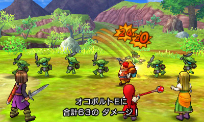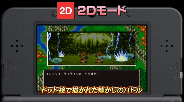 As with the rest of the game, the 3DS version features both a 2D and a 3D mode – you can choose between 2D sprites or 3D models of the characters being displayed in battle. The game uses the series’ traditional command-based battle system. Two new monsters, Mandra and Ocobolt, can also be seen. Finally, there seems to be some sort of new combat element that’s activated when the protagonist is surrounded by a blue aura – though sadly the magazine doesn’t go into any more detail than that.
