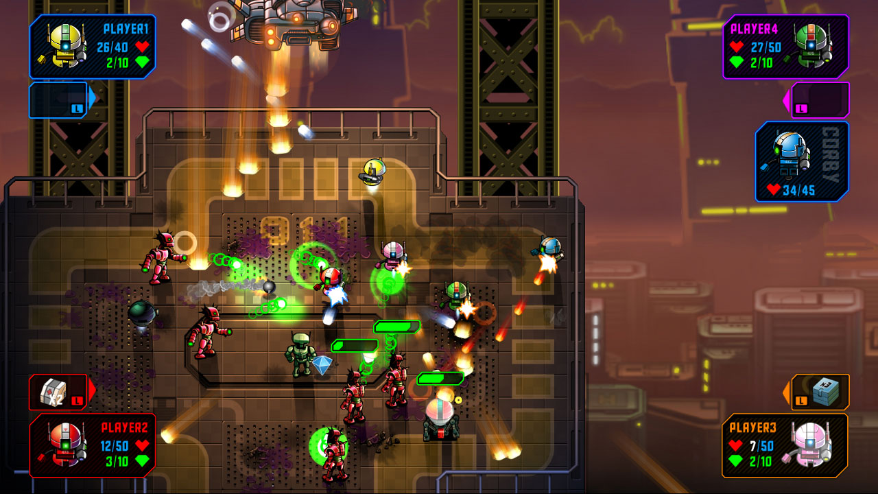 Lots of robots, lots of lasers, lots of aliens, lots of explosions! The numerous retro arcade influences are front and center, but spiced up with a colorful modern style, a generous helping of sci-fi intrigue, and a dash of RPG ELEMENTS!