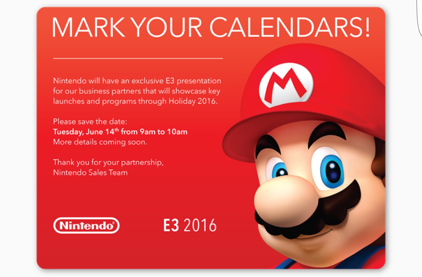 Aside from highlighting the upcoming Zelda game, Nintendo isn’t doing a whole lot at E3 this year. That being said, the company will be hosting a presentation for “business partners that will showcase key launches and programs through Holiday 2016.” Nintendo has conducted similar events in the past.