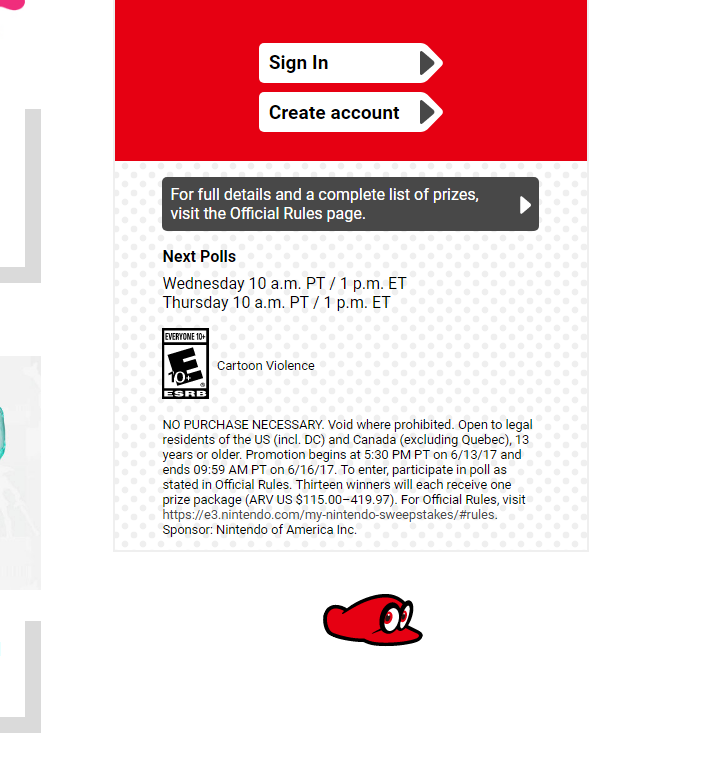 Nintendo’s E3 wesbite has a hidden little secret for those who want to get more Platinum Points for their My Nintendo account. If you scroll down to the daily poll section, Cappy should be floating down a bit directly underneath it. Click Cappy and you get 20 Platinum Points!