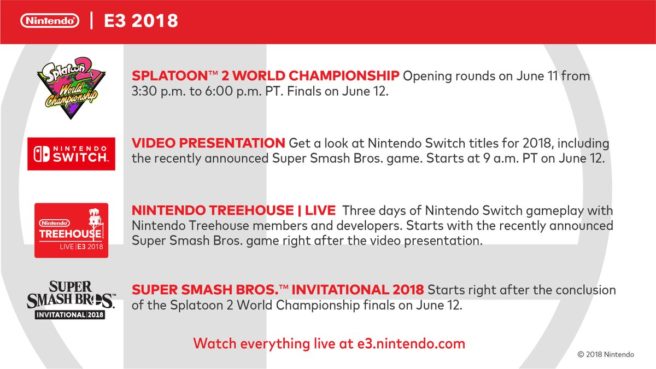 Now that seems to have changed. Nintendo updated its E3 website today, and it now includes the following title for the presentation: “Nintendo Direct: E3 2018”. It states specifically, “Three days of Nintendo Switch gameplay with Treehouse members and developers, starting right after Nintendo Direct: E3 2018 with Super Smash Bros.”